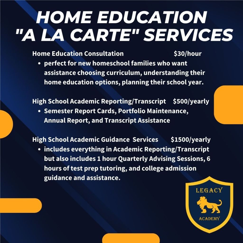 If you are a homeschooling family and you are not interested in taking classes with Legacy Home Education Program but you are interested in consulting, transcript, reporting, or academic advising please see the “a la carte” services Legacy Home Education offers.