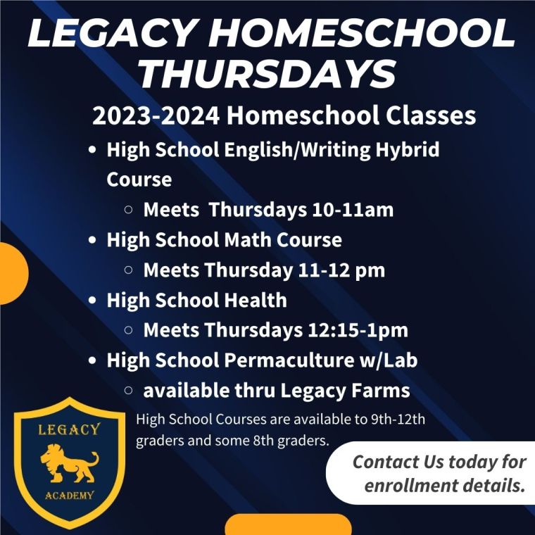 Legacy Home Education is proud to offer additional programs for homeschoolers at our private farm at Legacy Farms of Lake County. Click the link or visit us at http://www.thisislegacyfarms.com, click the link for Home School Programs for programs specifically for homeschoolers.